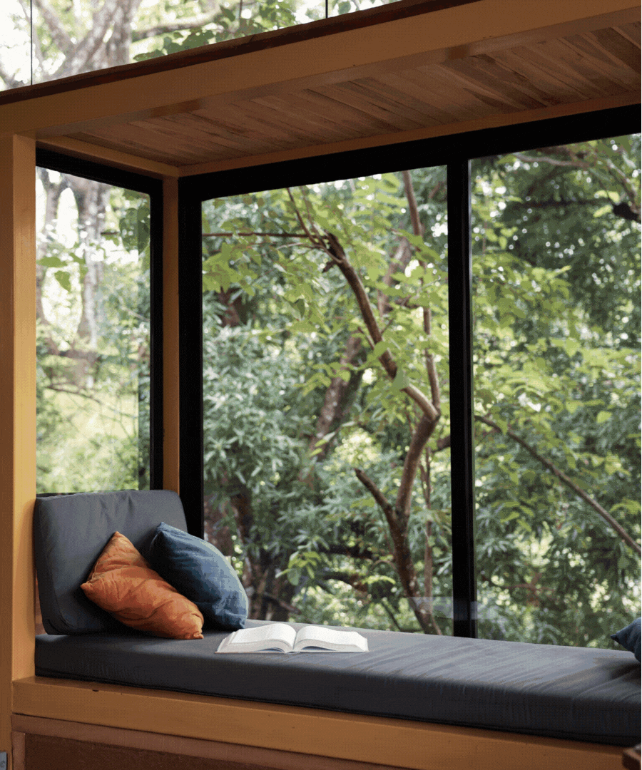 Welcome to our open-concept, air-conditioned lounge for socializing, resting and working. Featuring: a harvest table for collaborative work, lounge areas with the most comfortable seating, a secluded siesta loft, a bay window, and a quiet deck below towering mango trees where you’ll likely catch a glimpse of lazing howler monkeys.